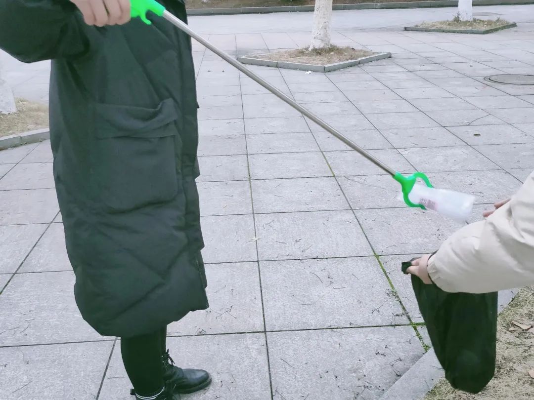 志愿者们不畏刺骨严寒,为建设文明美丽一师贡献力所能及的力量。志愿者们有的踏足平坦的剧场大道、操场地域,将目所能及的白色垃圾捡入垃圾袋中;有的探身于林荫小道 ,将隐藏于草木之间的“环境破坏者”终归于袋;有的走入教学区域,将走廊卫生做到干净整洁。数九寒冬,可弯腰行动的志愿者们活跃在校园的身影却温暖了整个校园。