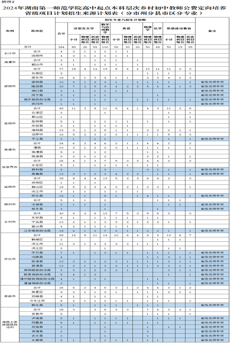 高中起点本科层次乡村高中教师公费定向培养省级项目计划招生来源计划表(分市州分县市区分专业)