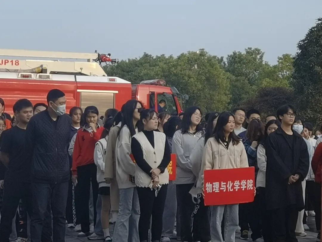 本次消防演练共分为应急疏散逃生、灭火实操观摩、消防安全常识宣讲、灭火实操四部分。活动伊始,李冰老师就消防演练的安全流程作出了明确的规定,并简单介绍了逃生安全事项和方法。随后师生按要求分散到各楼层等待命令。当楼内广播通知响起时,在滚滚硝烟中,物化院学生弯着腰,用手帕、毛巾等捂住口鼻,沿着学校指定楼梯口快速前进,有序撤离到前坪集合。期间,消防官兵开展灭火、营救被困人员、举高喷射类消防车大跨度出水灭火等活动,以模拟火灾真实场景,让师生切身体验火场逃生,提高在发生火灾时能够准确判断、沉着应对的能力。
