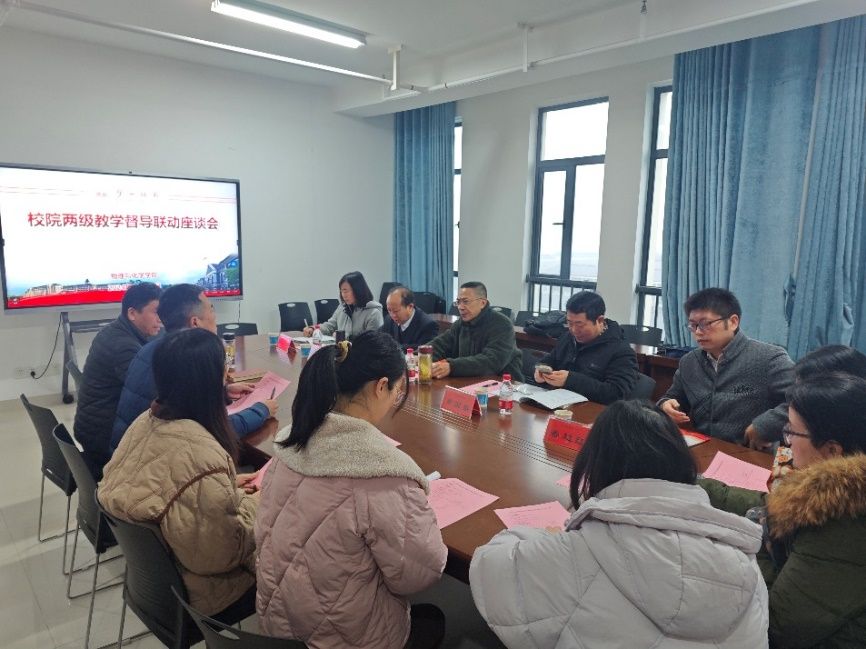 12月10日上午第三节课,校院两级督导组成员在润寰北303教室听了董建玉老师的《有机化学(一)》课程。随后,督导组成员在百熙楼1013会议室召开了校院两级督导联动座谈会。会议由陈志武书记主持,邹立军副院长关于近期85po
