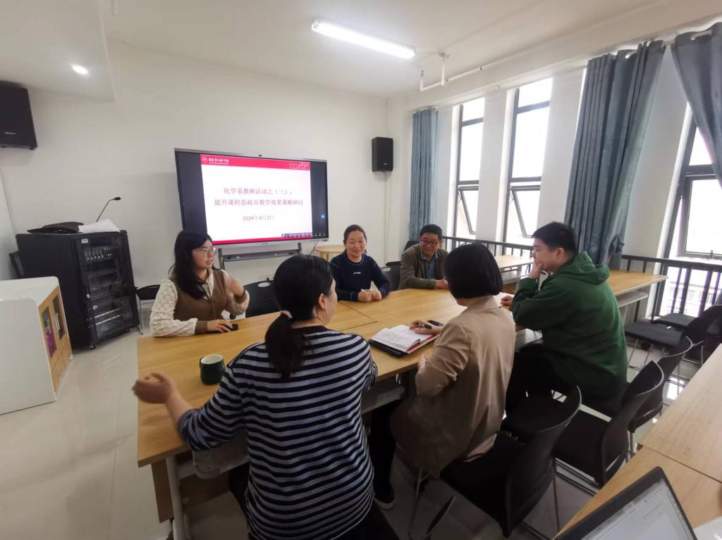 为贯彻落实学校本科教育教学会议精神,进一步加强课程思政建设,4月2日下午,化学系以“提升课程思政及教学效果”为主题,进行了本学期第三次教研活动,活动由系主任董建玉主持,化学系苏琼、陈万平、卢艳、王石功、侯敏老师参加。