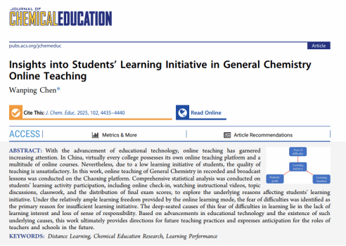 陈万平老师的论文“Insights into students’ learning initiative in general chemistry online teaching”深入剖析了线上化学课程中学生的学习表现与学习成效之间的关联。通过收集两百多名学生一学期的在线学习数据,涵盖视频观看时长、作业完成情况、线上互动参与度等关键维度,运用统计分析与相关性研究方法,揭示畏难情绪是导致学生学习主动性不足的主要原因,剖析其深层根源在于学生学习兴趣的缺失与责任感的淡化。这一成果不仅丰富了化学在线教育的实证研究,更为化学教师优化线上教学策略提供了有力依据。