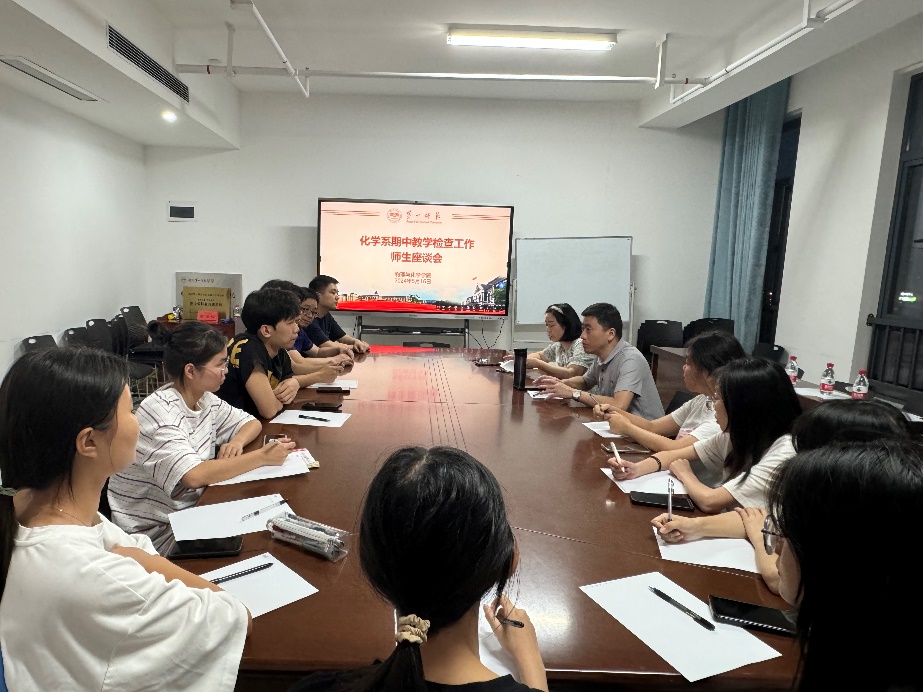 根据学院期中教学检查工作的安排,5月16日晚,化学系师生代表座谈会在百熙楼1013会议室召开。教师代表陈万平、卢艳、王石功,以及2023级化学专业学生代表参加了会议。物化院副院长、化学专业建设负责人邹立军主持会议。