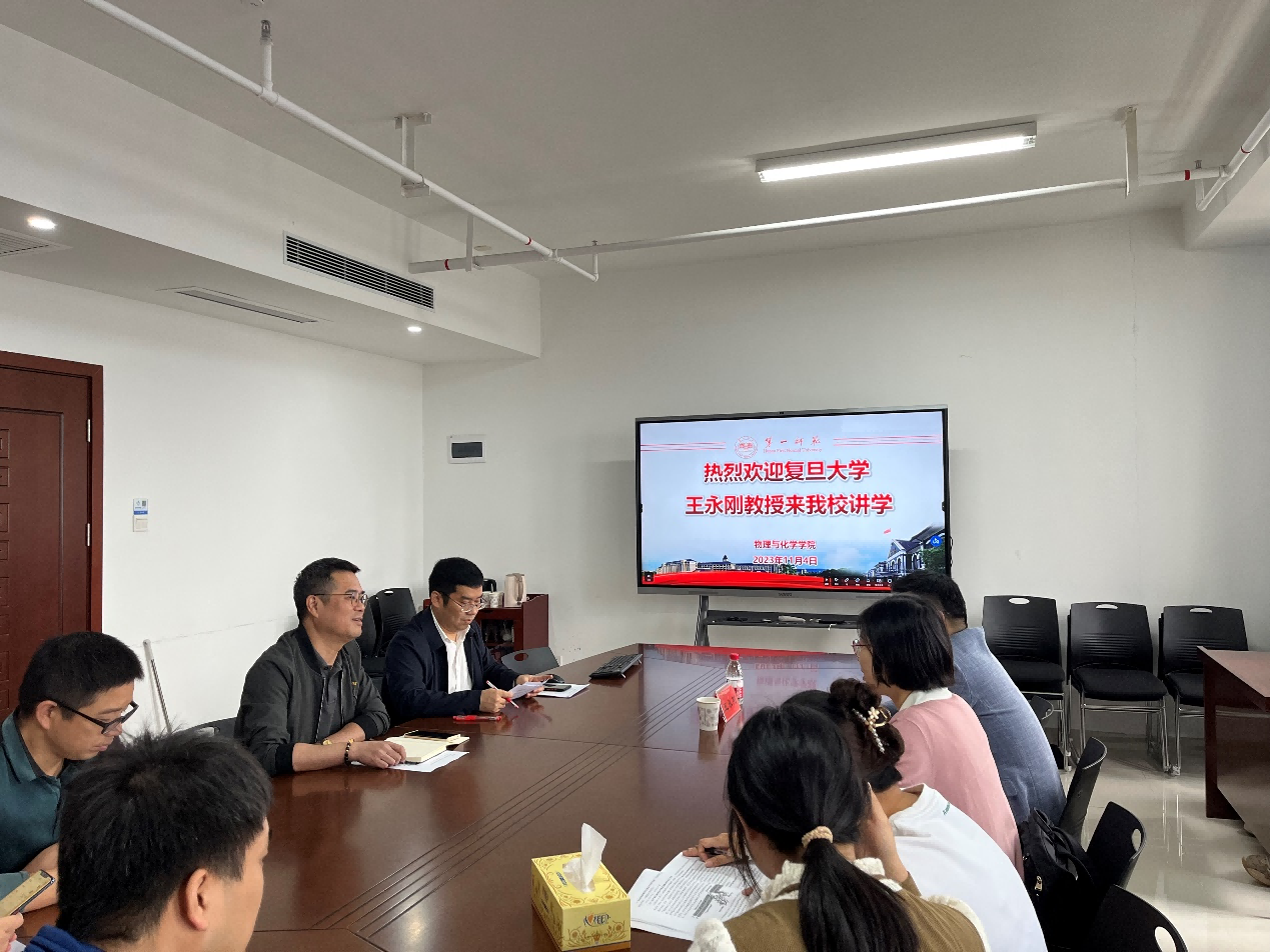 2023年11月4日上午,复旦大学博士生导师王永刚教授应邀来我校进行学术讲座。学术交流会在百熙楼1013会议室进行,吴昌义副院长主持,陈志武书记出席,陈万平、董建玉和苏琼等老师及化学专业学生一同聆听。