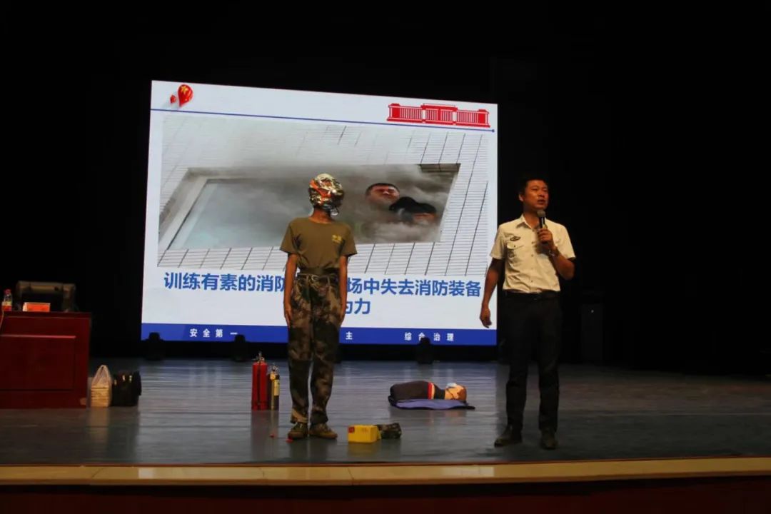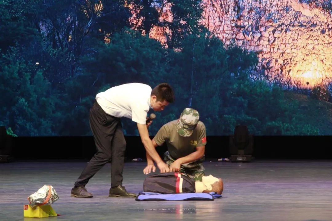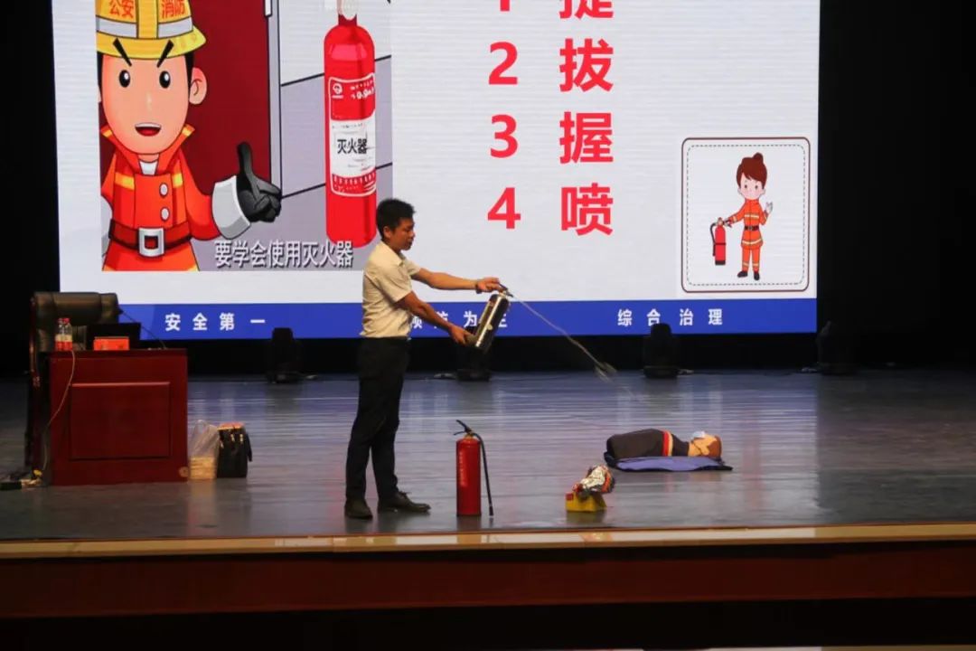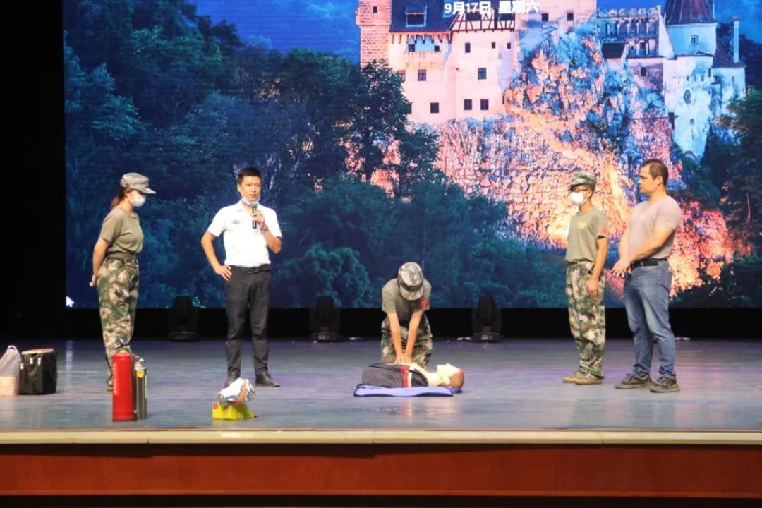 接着,新生们来到田汉剧院参加消防安全与急救知识讲座,本次讲座由旭安消防教官唐高讲授。唐教官通过分析全国各地重大火灾案例,以视频、图片等形式为同学们讲述了引发火灾的原因以及火灾发现时如何科学地逃生、正确地报警等消防安全知识,并现场演示了灭火器、防毒面具等多种消防用具的使用方法和人工呼吸急救方法。讲座期间,不少新生踊跃报名,在唐教官的指导下体验用假人进行人工呼吸急救,将本次讲座的氛围推向了高潮。