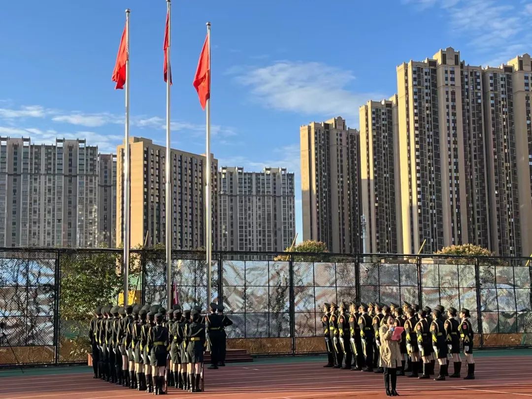 国旗队护旗手迈着矫健的步伐,护着鲜艳的五星红旗入场,在全体师生的注目下,五星红旗冉冉升起,在场师生敬礼仰注,齐唱国歌,仰望五星红旗迎着朝阳升起,全体师生心中盈满自豪之情。