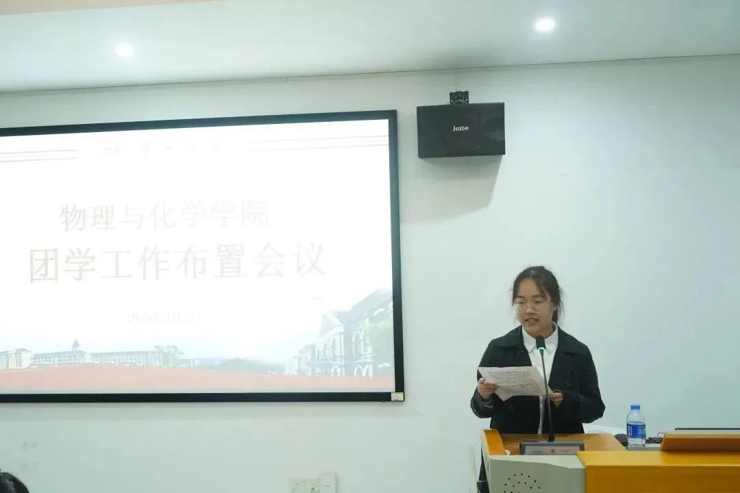 会议伊始,由物化院学生会执行主席杨娜做学生会工作汇报、团委办公室主任曹裕做分团委工作汇报。接下来辅导员李珊老师就各部门工作开展情况进行总结和部署安排。而后团委书记石慧老师做工作情况分析总结,对各部门真情奉献的服务精神表示了肯定,同时也对团学工作人员提出了期望:第一,要珍惜团学这个平台;第二,以身作则,工作学业两不误。